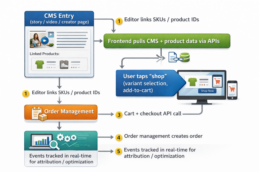 | CMS-led shoppable | CMS is the source of truth; product modules are embedded into content | Brands with heavy storytelling, creator programs, editorial SEO, launch calendars | Commerce teams feel “blind” unless instrumentation is tight; risk of inconsistent merchandising rules |