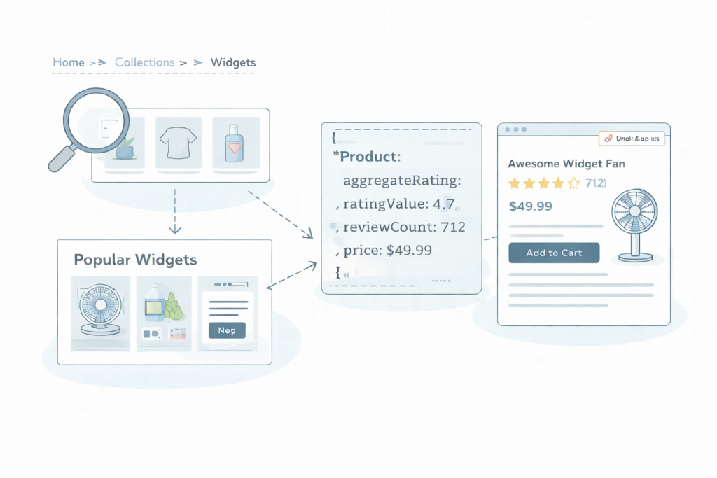 Structured data helps when it’s truthful and complete. Schema.org’s Product type and aggregate ratings are foundational references (and Google’s structured data guidance clarifies what’s required for review snippets). Internal linking matters too: content → collections → PDPs, with consistent canonicals and clear UX pathways so search discovery turns into purchase paths instead of dead ends.