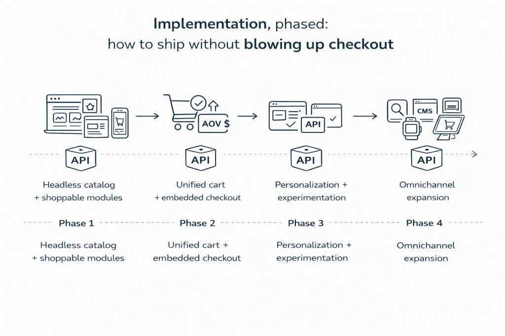 Most failures come from trying to go “full headless” in one leap—front-end rewrite, new CMS, new data model, and new checkout flow all at once. A safer pattern is a phased approach where you earn speed without gambling trust.
