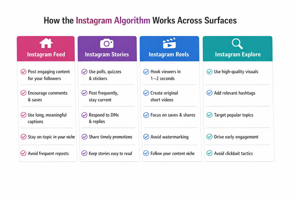 Instagram does not use a single algorithm. It evaluates different signals depending on surface, type of content, and user context.