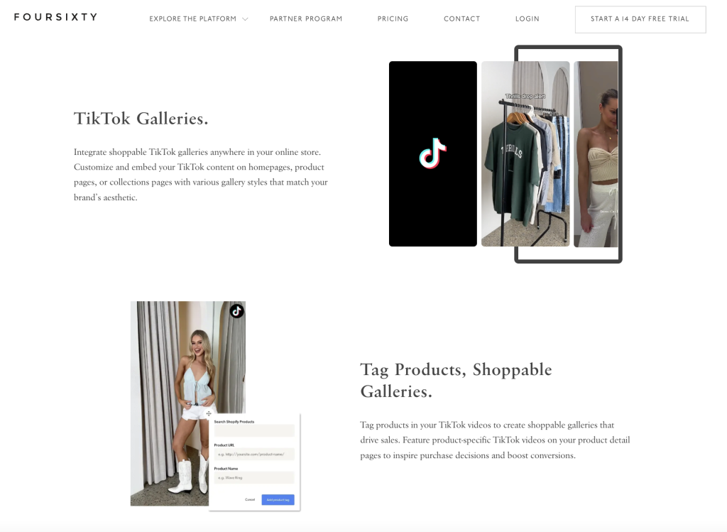 Here at Foursixty, we can help you turn your best TikTok videos into shoppable galleries across your website, landing pages, and product pages.